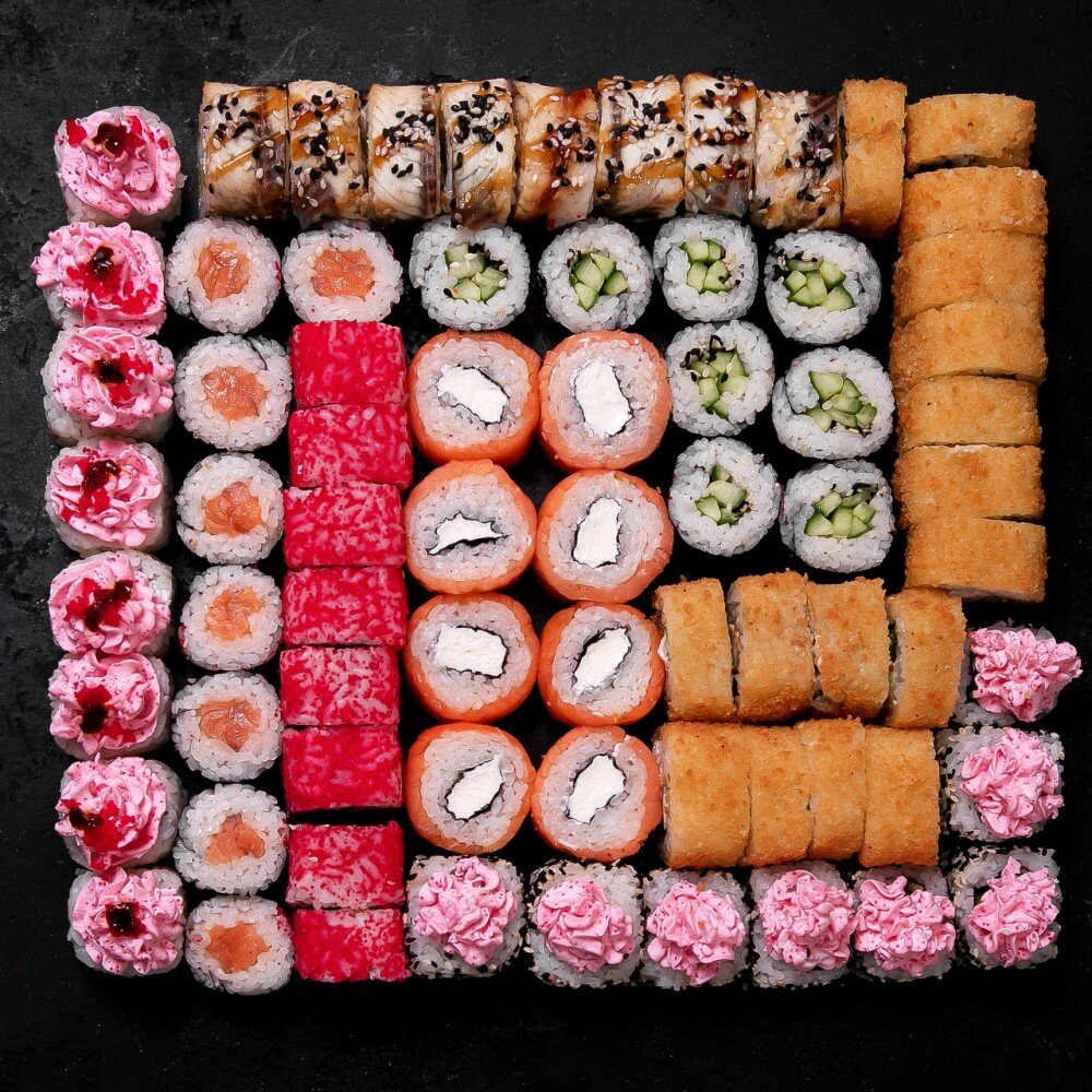 Калифорния, Филадельфия, Унаги Онигара, Ролл Магма, Каппа Маки, Унаги темпура, Чикен Темпура, Сяки Маки, Лава Ролл Красный дракон +соевый соус, васаби, имбирь