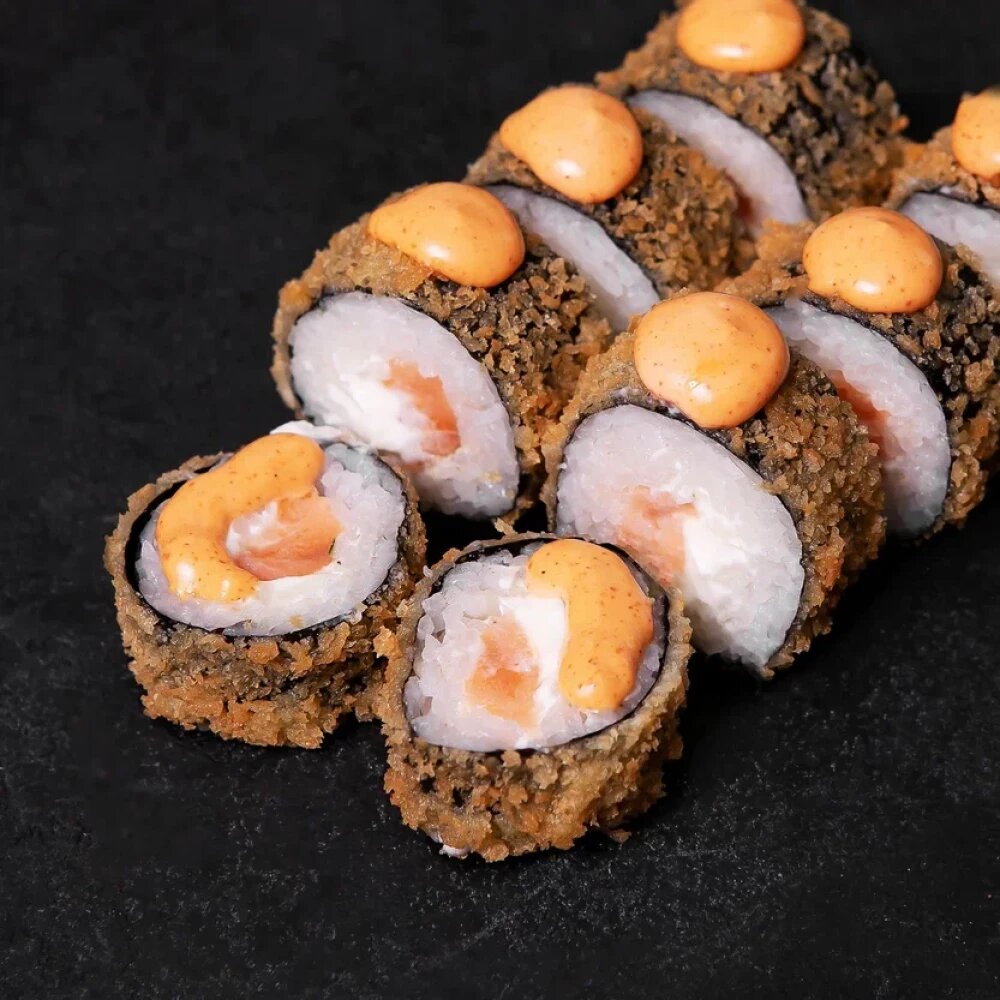 Сёмга терияки, сыр творожный,спайси соус,рис,нори,в хрустящей панировке