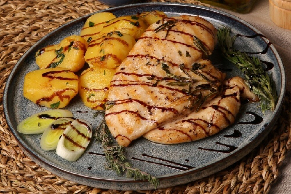 диетическая куриная грудка, обжаренная на гриле с пряными специями. Подаётся с картофелем по-деревенски