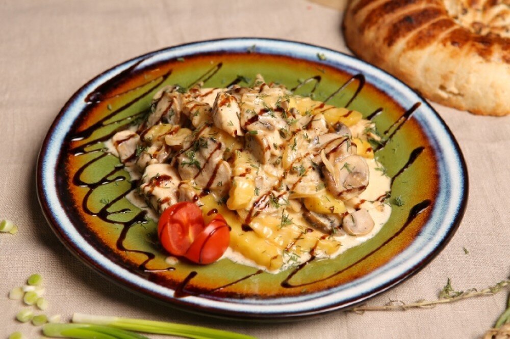 куриное филе, обжаренное с картофелем фри, грибочками и луком, томленое в сливках